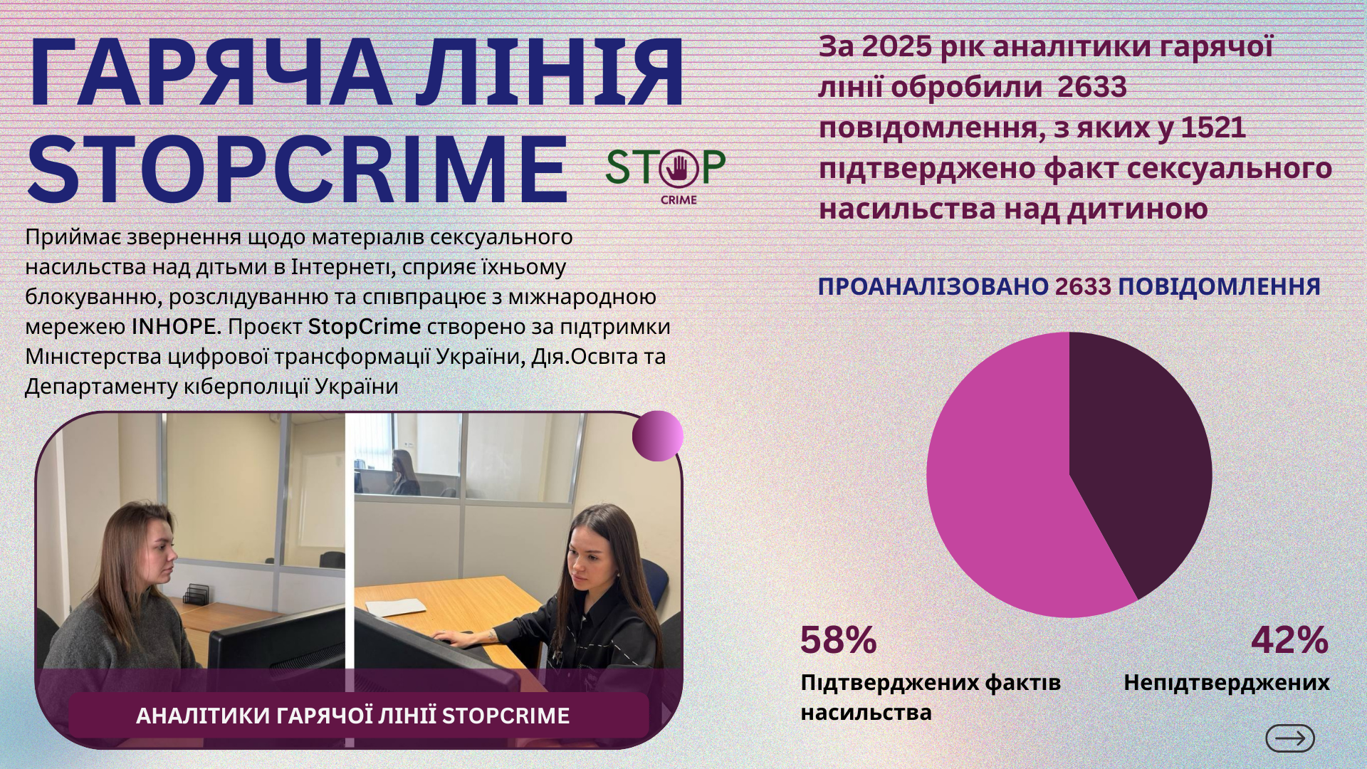 Так, інтимні фото і відео – це завжди про надзвичайну вразливість. І тут доречно розповісти про рік роботи гарячої лінії Стоп крайм в Україні. Аналітики проаналізували 2633 повідомлення про сексуальне насильства над дітьми в Інтернеті. І 1521 з них передали в поліцію, бо йшлося про реальний злочин, про 1521 дитину, яка у той чи інший спосіб постраждала від дій сутенерів, розбещувачів, педофілів.